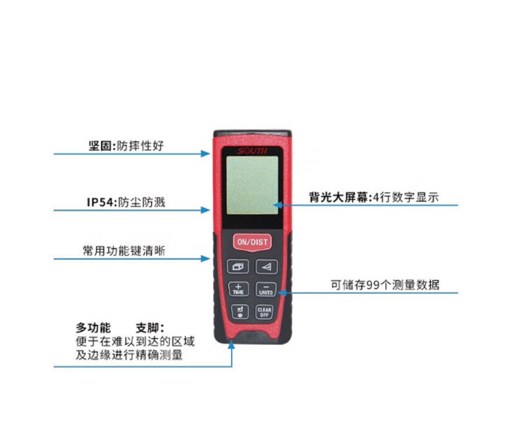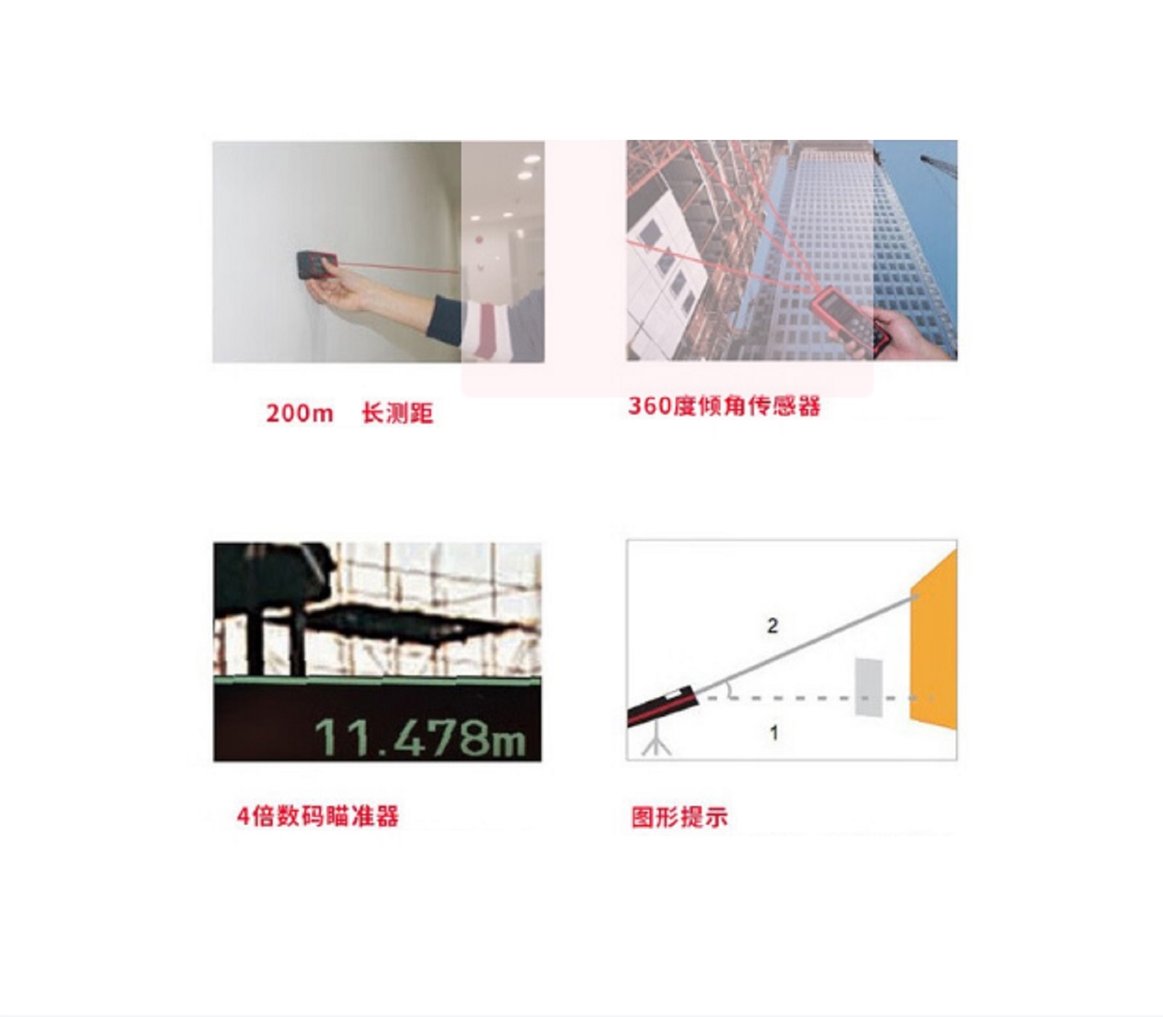 基本功能:具备测距、测角、测面积、测体积功能,室内外通用。